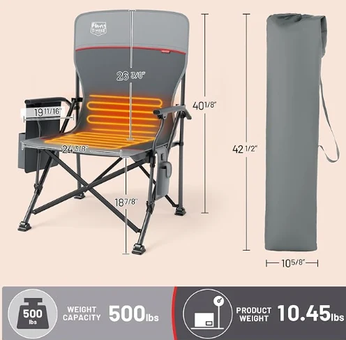 Персонализиран отопляем сгъваем стол, двойни зони за отопление за гръб и седалка затопляне до 131 ° F само за 10 секунди. Три настройки на топлината (104 ° F, 122 ° F, 131 ° F) осигуряват топлина за всеки външен случай (батерията не е включена).