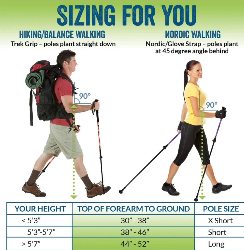 По -дългият размер (за тези 5'7 "до 6'2") разширените полюси се регулират от 115 см на 135 см (45,25 "до 53"). Всеки тежи само 11 унции. Пропорциите на тялото са уникални, следователно най-точното измерване на оразмеряването е от земята до върха на предмишницата ви, когато е успоредно на земята, а по-дългият размер е за тези с измерване на предмишницата до земята от 44 'до 52 ".