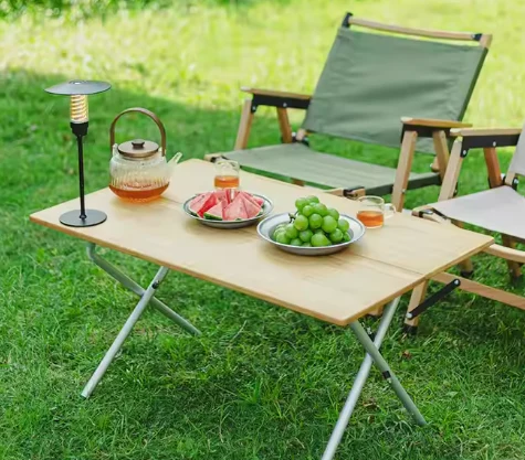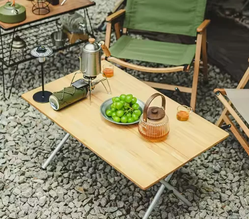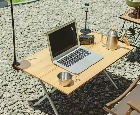 Сгъваема преносима бамбукова и алуминиева маса, която е здрава, здрава и екологична. И ефективен водоустойчив. Гладкият плот е идеален за поставяне на напитки, закуски или оборудване за готвене.