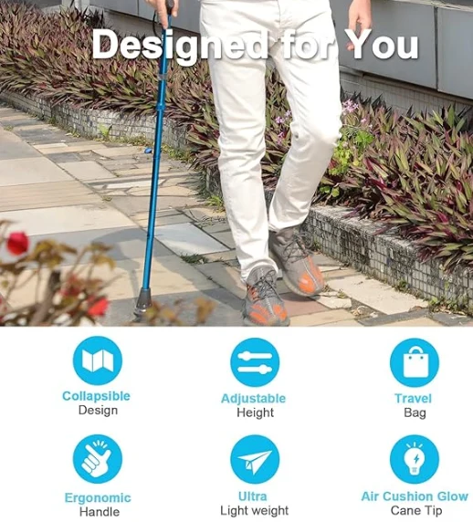 Сгъваем телескопичен ходещ бастун, върхът се запалва през нощта, което значително гарантира безопасността на нощното ходене. (С експозиция в светлина само за определено време, светещият конус стига до видимост в тъмнината.