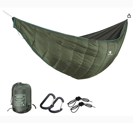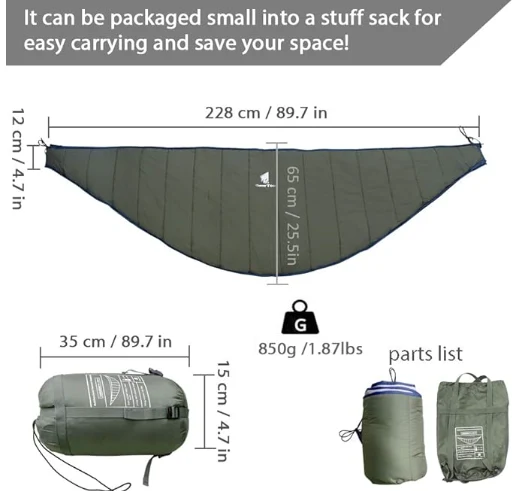Хамак за къмпинг за пътуване, комбинирайте комфорта на спален чувал и изолацията на хамак, улеснявайте да се поберат с всякакъв хамак със стандартен размер, поддържайки ви топло в студено време. Той е идеален за къмпинг, раница, лов, дейности на открито, алпинизъм