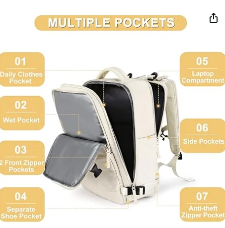 Унисекс водоустойчива раница, ежедневен джоб за дрехи може да побере 4-6 парчета тънки върхове или панталони, които могат да отговорят на нуждите на кратки пътувания или бизнес пътувания за 2-3 дни; Може да се използва и за съхраняване на университетски канцеларски материали като списания, а отделното отделение за лаптоп
